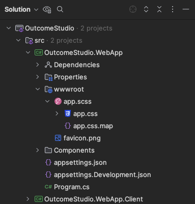 dotnet new blazor -n OutcomeStudio.WebApp -o src -int AutoYou'll note that I'm using Auto as the render mode. This is optional, but I know I'll need it in the future, so I went ahead and added it now. Using this option creates two projects (server side and client side) and its own solution file, so the next step is to fix that.